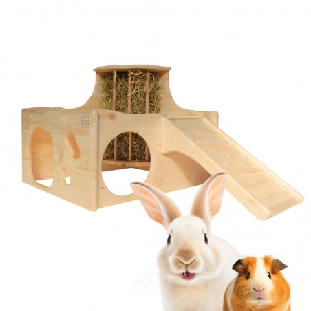 Tento dřevěný domeček SENOHRAD s rampou a patrem spojuje praktický úkryt, místo pro odpočinek, krmení a vyhlídku v jednom.