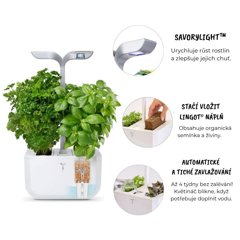 Inteligentné senzory navyše sledujú intenzitu okolitého svetla a automaticky upravujú intenzitu vlastného osvetlenia, aby ochránili rastliny pred spálením. Pri vyčerpaní nádrže vás záhradka blikaním upozorní, že vodu treba doplniť.