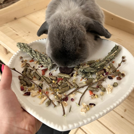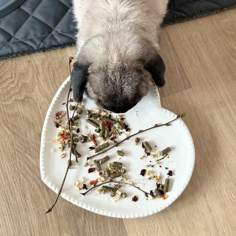 Tanier pre miláčikov v tvare srdiečka je vyrobený z glazovanej keramiky, ktorá sa jednoducho udržuje a čistí. Je tiež odolný voči zúbkom králikov či morčiat.
