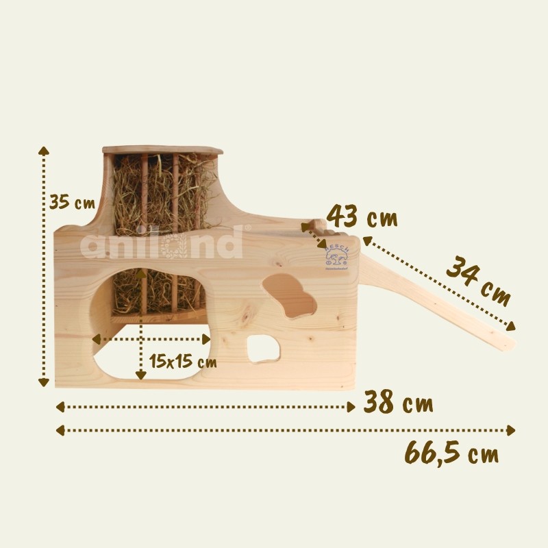 Tento drevený domček SENOHRAD s rampou a poschodím spája praktický úkryt, miesto na odpočinok, kŕmenie a vyhliadku v jednom.