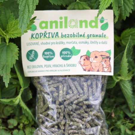 Žihľavové granule patria medzi bezobilné bylinkové granule ANILAND, ktoré boli lisované za studena. Tým dochádza k uchovaniu cenných vitamínov a minerálov a tiež k podpore brúsenia zúbkov vďaka veľkosti a tvrdosti granúl.